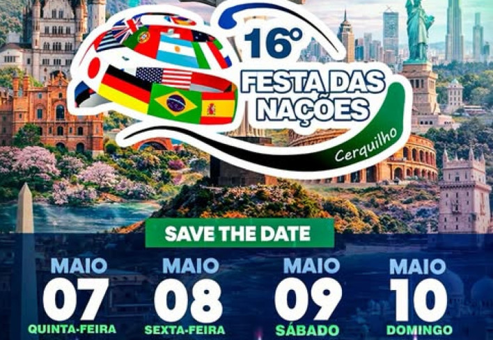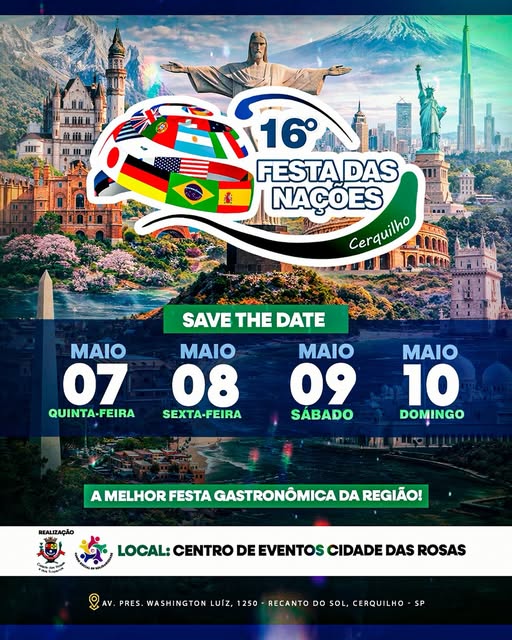 Prepare-se para viver uma experiência incrível com muita cultura, gastronomia e tradição! Serão dias especiais reunindo sabores do mundo, apresentações culturais e aquele clima que só Cerquilho sabe fazer! Dias 07, 08, 09 e 10 de maio.